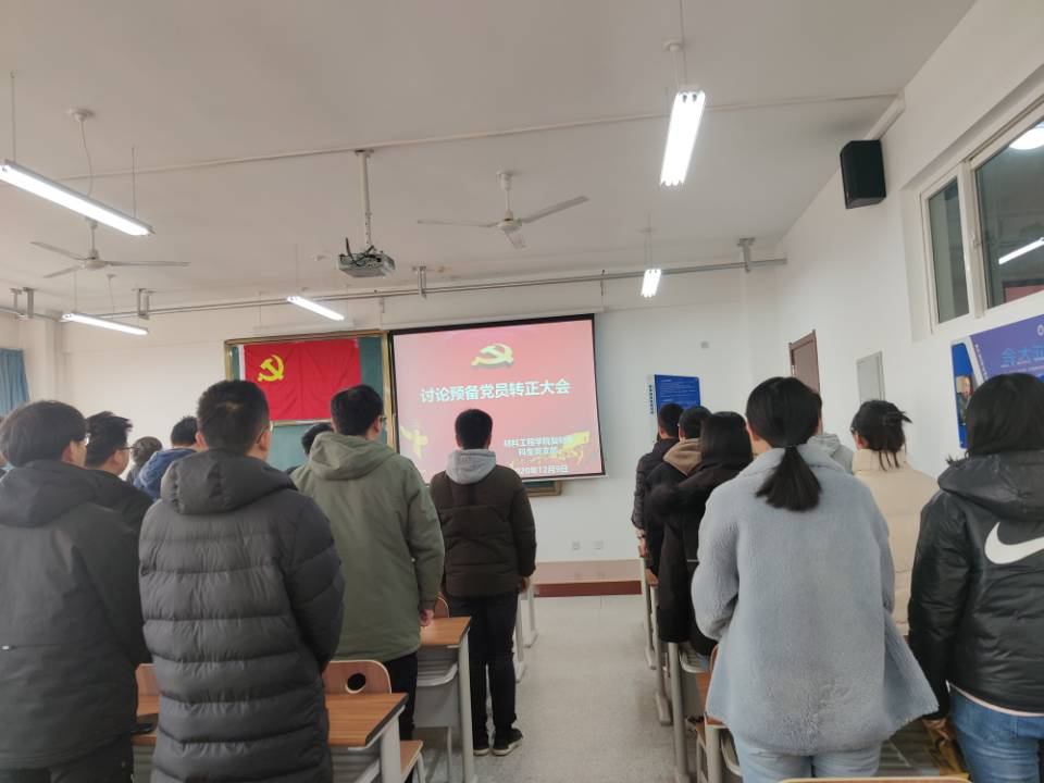 培养人宣读教育考察情况及考察意见,介绍其这一年预备期中的思想,学习、生活上的表现.宣传委员刘创宣读党支部综合评议考察意见,并表明支部一致认为该四名同志政治立场坚定、旗帜鲜明,符合转正要求的立场,支部书记雒老师宣读大会一致同意的表决结果,