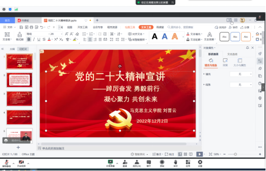 刘晋云老师以准确理解党的二十大的主题为切入点,结合自身学习体会,从党的二十大的主题和主要成果,过去5年和新时代10年的伟大变革,马克思主义中国化时代化新境界,中国式现代化,全面建设社会主义现代化国家的目标任务,坚持党的全面领导和全面从严治党,应对风险挑战等七个方面对党的二十大精神做了全面、详细的阐释。