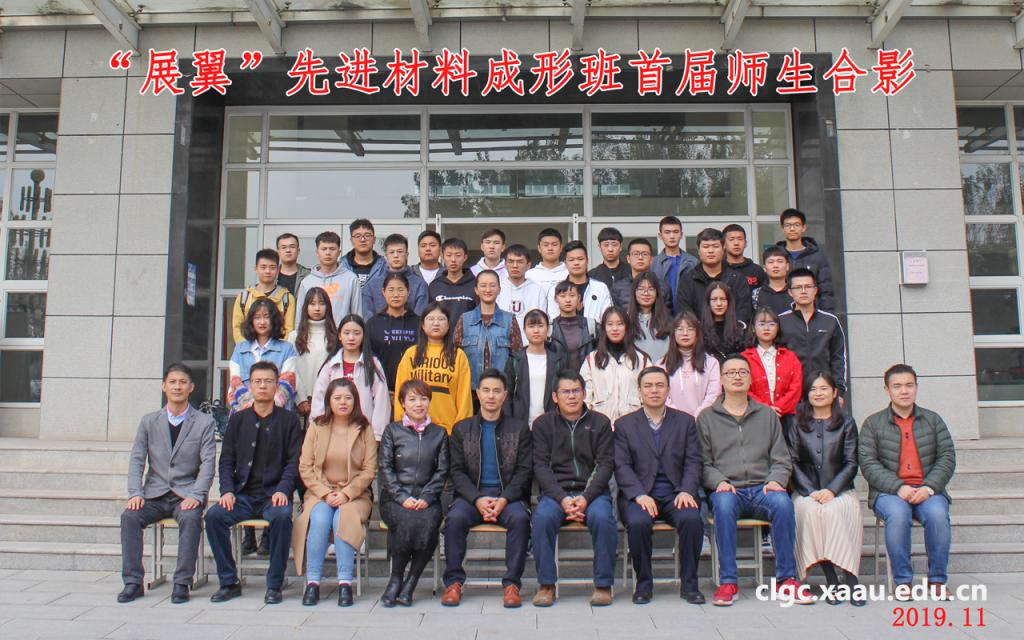 仪式后,“展翼”先进材料成形班的全体师生与学院领导在阎科楼正门前合影留念。