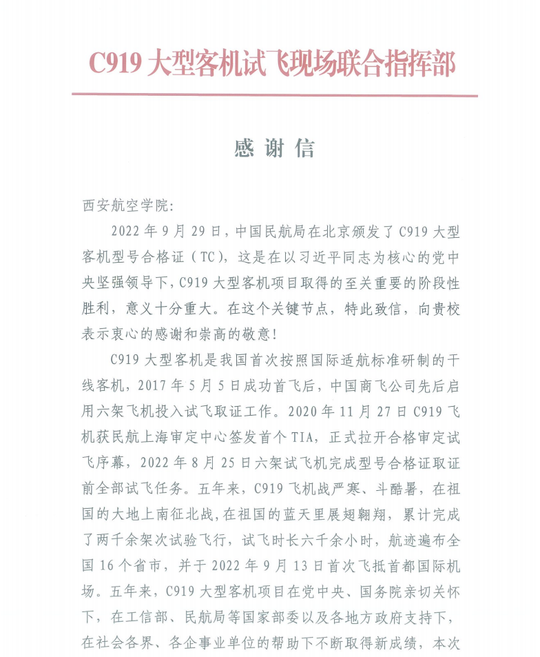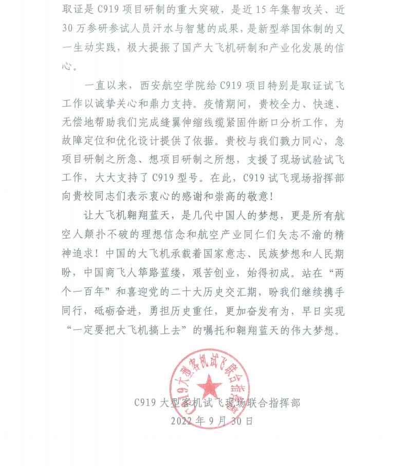 C919大型客机试飞现场联合指挥部在感谢信中表示,世界杯体育官方网站与他们勠力同心,急项目研制之所急,想项目研制之所想,支援了现场试验试飞工作,大大支持了C919型号。希望能够继续与世界杯体育官方网站携手同行,砥砺奋进,永担历史重任,更加奋发有为,早日实现“一定要把大飞机搞上去”的嘱托和翱翔蓝天的伟大梦想。(文、图/世界杯体育官方网站)