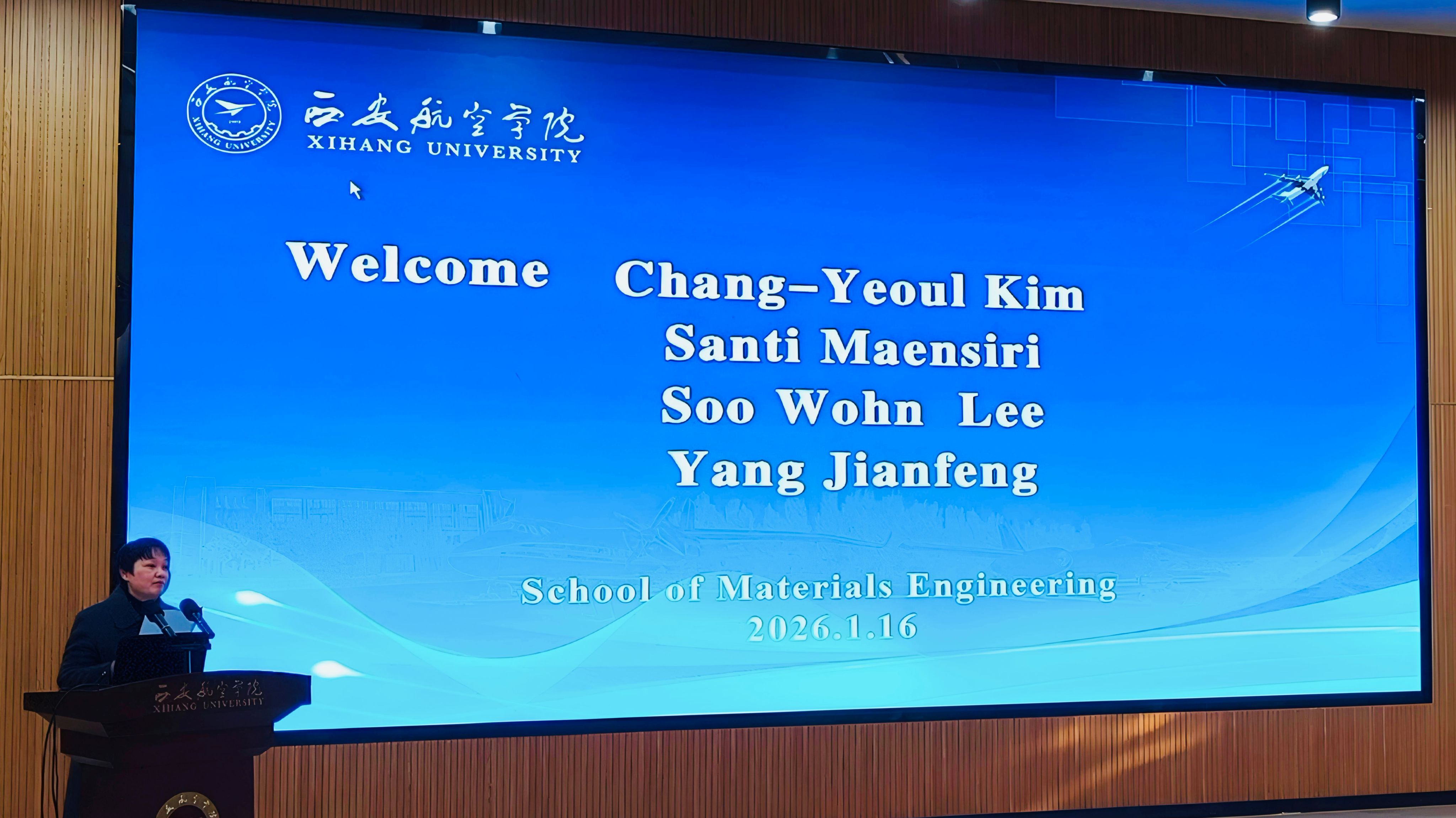 为深入推进材料学科的国际交流与合作,航空材料与新能源学院依托陕西省"轻质结构与表界面多功能材料学科创新引智基地",于2026年1月16日成功举办国际知名专家系列学术报告会。本次报告会特邀韩国鲜文大学Soo Wohn Lee教授(国际材料研究学会联盟IUMRS前主席)、泰国苏兰拉里理工大学Santi Maensiri教授(泰国材料研究学会主席)以及韩国陶瓷工程技术研究院Chang Yeoul Kim研究员三位国际顶尖学者莅临世界杯体育访问交流。报告会由院长于方丽教授主持,学院全体教师、硕士研究生及部分本科生共同参与了此次学术盛会。