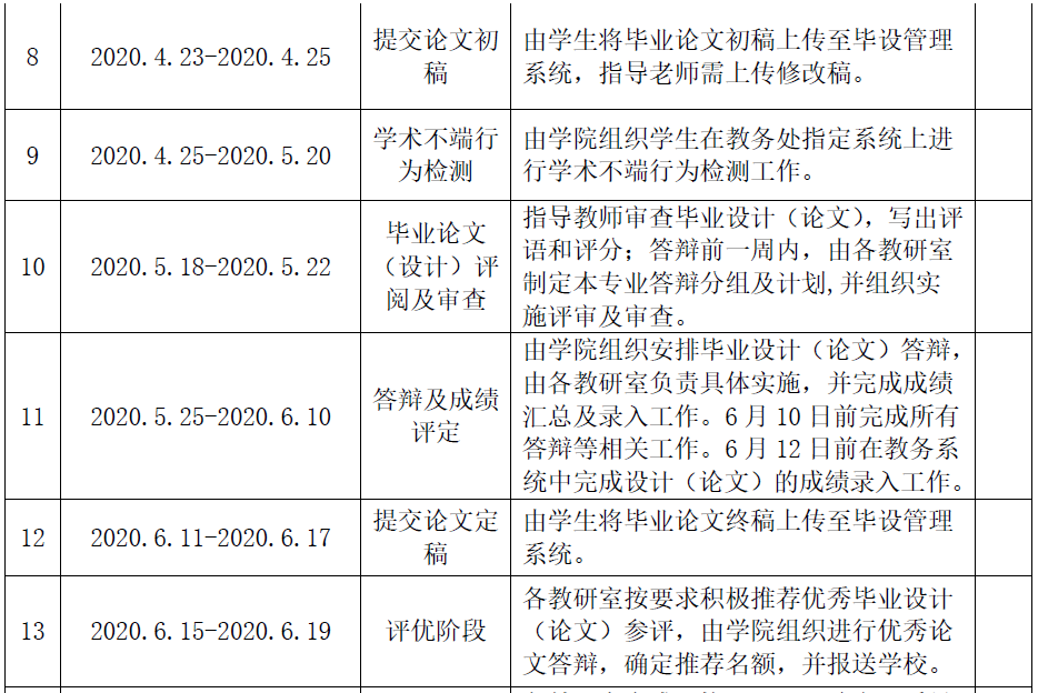 各专业需按照学院毕业设计(论文)工作日程安排及通知积极开展相应工作,除初期检查、中期检查外学院还会安排不定期抽查学生论文进展情况、资料完善情况以及指导教师指导情况并记录留底。