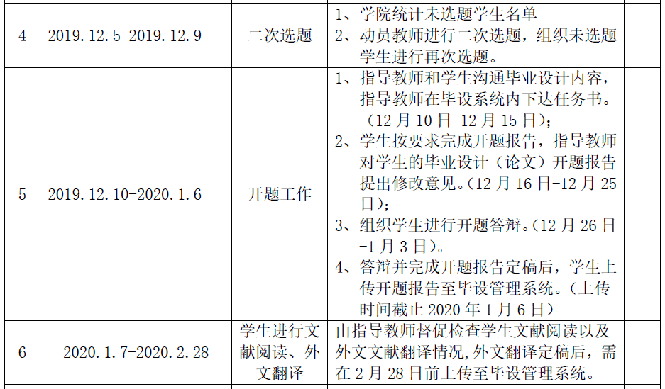 (1)各教研室应召开毕业论文工作动员及选题指导会。向学生讲解毕业论文工作的具体要求及各项工作时间截点,与学生进行充分沟通,指导学生按时在毕设系统进行选题,同时教师需在教务系统确认学生志愿,双选完成后,即可在毕设系统中向学生下达任务书。未被选中的学生由各专业负责人分配课题。双选结束后,由主管院长审核选题结果并发布,由学院将选题情况汇总存档,并报教务处备案。