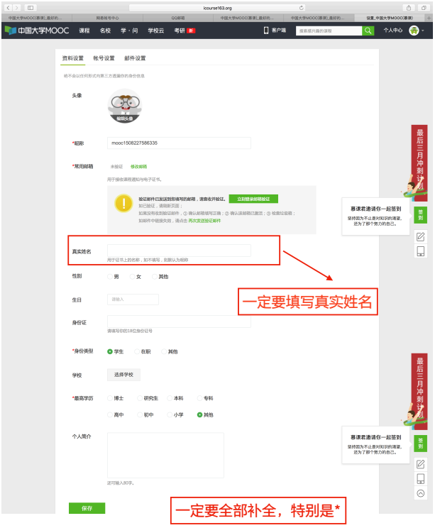 (1)各二级学院(部)老师需注册中国大学MOOC平台上注册,注册步骤依照中国大学MOOC账号注册指南(附件1),特别注意:在完善个人信息时请在资料设置中将头像、真实姓名以及所有带“*”的都完善,申请账号后完成个人设置后将相应个人信息填写至中国大学MOOC账号汇总表(附件2)。