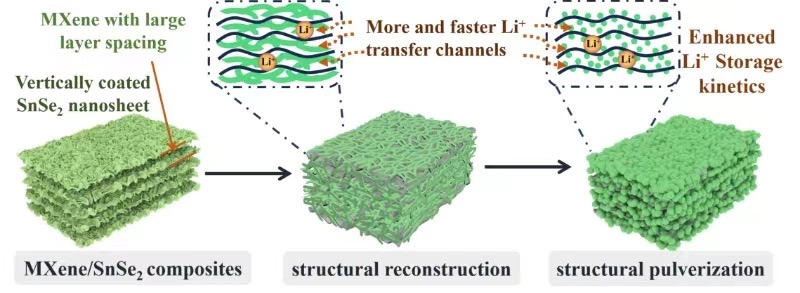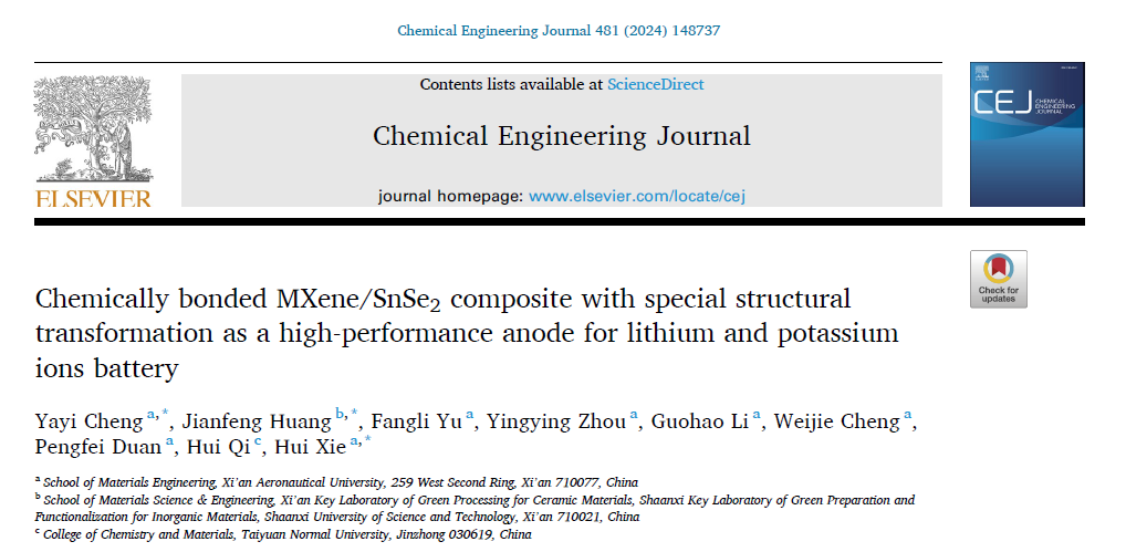 世界杯体育官方网站教师程娅伊副教授等人最近在国际知名期刊《Chemical Engineering Journal》上发表了题为Chemically bonded MXene/SnSe2 composite with special structural transformation as a high-performance anode for lithium and potassium ions battery的学术论文,世界杯体育为第一完成单位,陕西科技大学和太原师范学院是共同合作单位,程娅伊副教授为本文第一作者和通讯作者,世界杯体育官方网站谢辉教授和陕西科技大学黄剑锋教授为本文共同通讯作者。