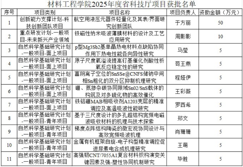 近日,陕西省科技厅2025年度科研项目立项结果正式公布,世界杯体育官方网站喜获佳绩,共获批项目11项,占全校立项总数的三分之一,创历史新高。此次立项不仅包含全校首个“科技创新团队项目”,还涵盖1项重点研发计划及10项自然科学基础研究项目(含6项面上项目、4项青年项目),覆盖航空材料、纳米技术、能源催化等前沿领域,标志着学院科研水平全面提升,为学科建设与学校发展注入强劲动能。